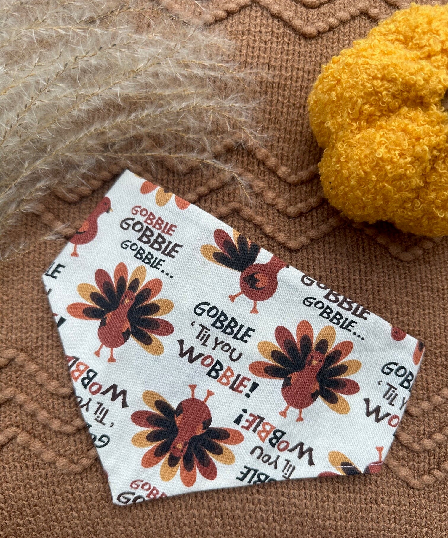 Get your Pup ready to "Gobble till you Wobble" on Thanksgiving with this turkey bandana! Our bandanas fit neck sizes 10-23".